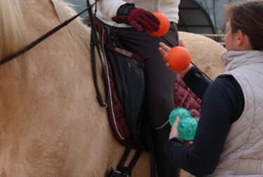 In meiner Sitzschulung arbeite ich mit gezielten Übungen und verschiedenen Materialien, um das Körpergefühl der Reiter*innen zu schulen und neue Bewegungsmuster erfahrbar zu machen. Ergänzend spielen innere Bilder eine wichtige Rolle: Sie helfen, komplexe Bewegungen verständlich zu machen und eröffnen dem Körper neue Möglichkeiten der Bewegung. Oft reichen bereits kleine Veränderungen im Körpergefühl, um eine große Wirkung auf Sitz, Hilfengebung und das Reitergefühl zu erzielen.